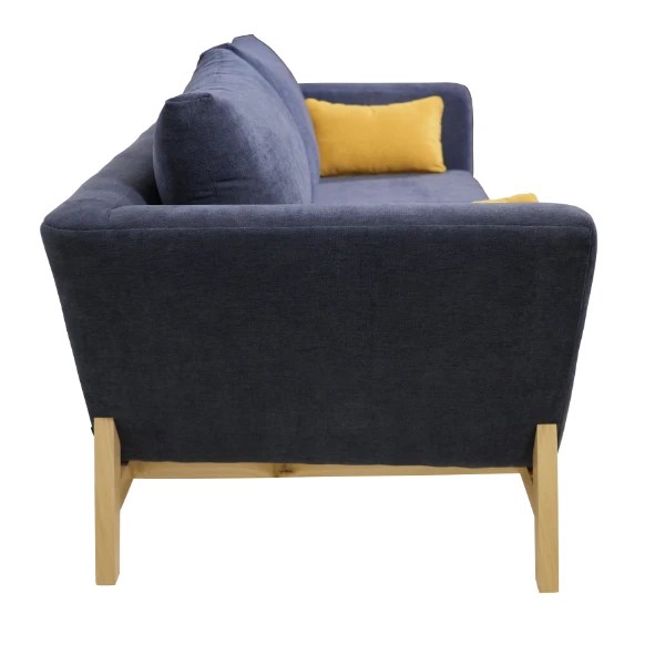 Material: Estructura interna de pino. Estructura externa de poplar terminada con laca de poliuretano. Asiento de hule espuma de 24 kg de densidad. Tela de poliéster. Cojines rellenos con fibra sintética premium.